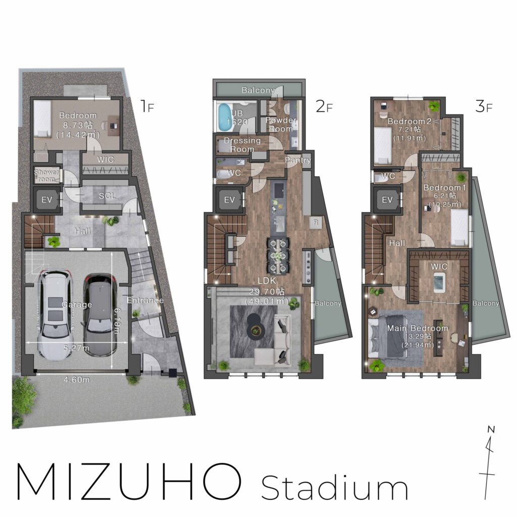 ■所在地/〒467-0061 名古屋市瑞穂区師長町27番5,8■交通/地下鉄名城線 瑞穂運動場東駅 徒歩約4分(約250m)■敷地面積/136.67㎡(41.34坪)■延床面積/243.81㎡(地下車庫26.56㎡を含む)(73.75坪)■地目/宅地■構造/木造ガルバリウム鋼板葺地上3階■用途地域/第一種中高層住居専用地域■都市計画/市街化区域■建ぺい率/60%■容積率/200%■その他/20m高度地区・緑化地域・準防火地域・宅地造成工事規制区域■建築確認番号/第R07確認建築愛建住セ20985号■設備/電気・都市ガス・上下水道■道路/南側接道幅員 約6.36m・間口 約9.48m■私道負担/無■学校区/名古屋市立弥富小学校・名古屋市立萩山中学校
